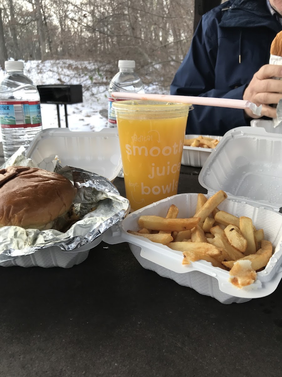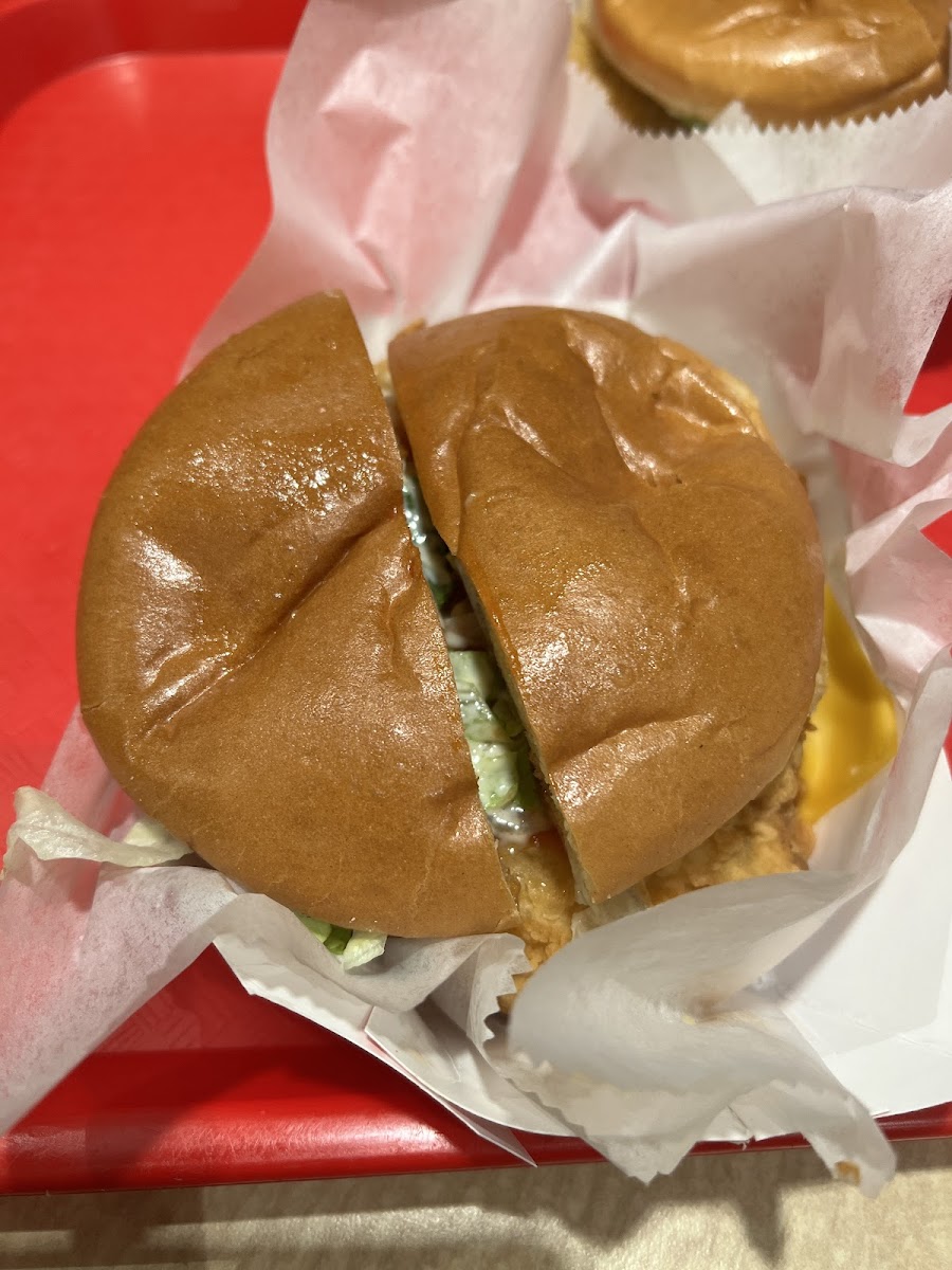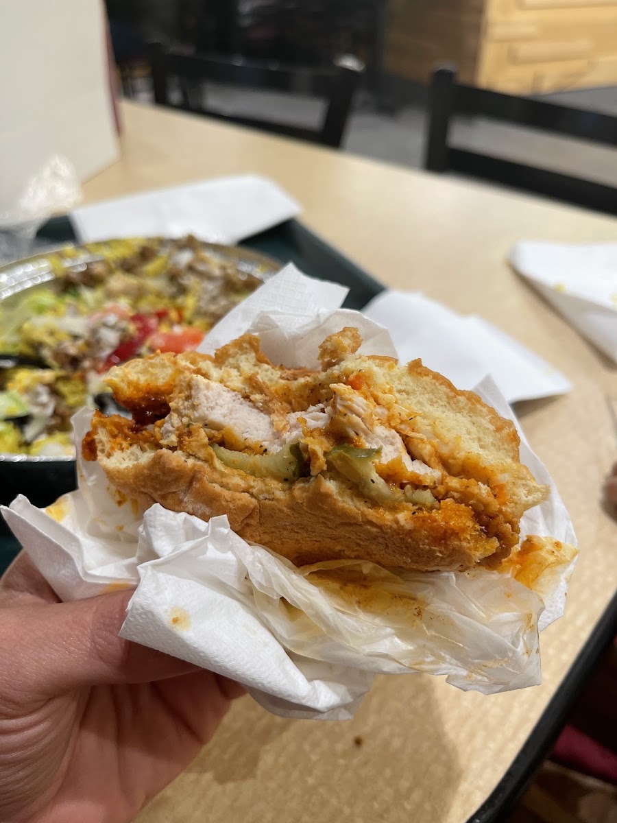 Service was nice, and there were plenty of seating spots. The spicy chicken sandwich was amazing, easily one of the best I have had. The chicken and lamb platter was just okay; the rice could be more flavorful and the portion of meat felt small. Prices were great and very affordable. There is also a smoothie spot inside the restaurant, which is a nice bonus. Overall, if the platter matched the quality of the sandwiches, this place would easily be a 5-star spot. But those chicken sandwiches are seriously next level!